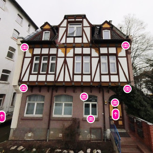 Für die digitale Begehung sind alle drei Gebäude und deren Umgebung in Form von 360°-Aufnahmen abgebildet und über Navigationselemente individuell begehbar. Details werden zusätzlich in Form von Fotos dargestellt.